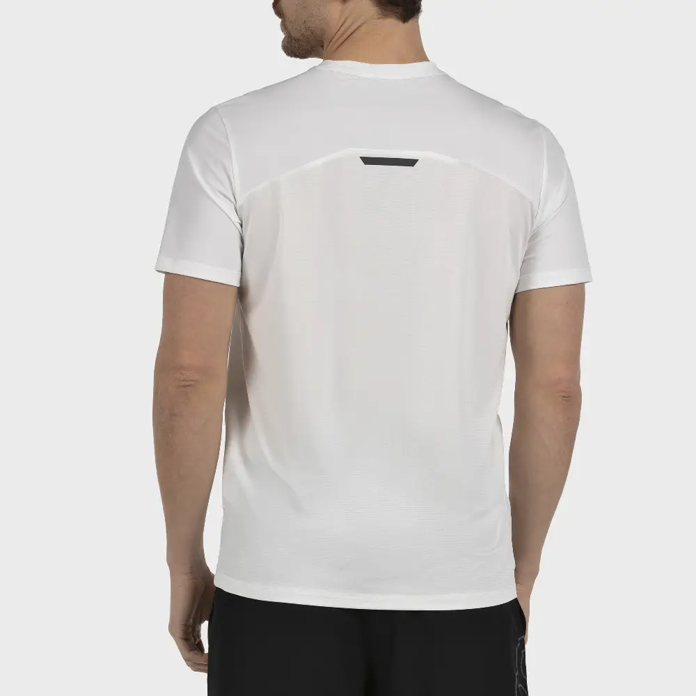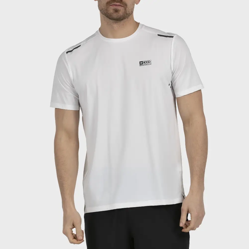 Camiseta deportiva de caballero +8000 modelo JELMI en color blanco, confeccionada en tejido técnico de poliéster para máxima transpirabilidad y confort. Su diseño funcional con detalles en contraste y logo en el pecho la convierte en una prenda ideal para entrenamientos, senderismo o uso diario