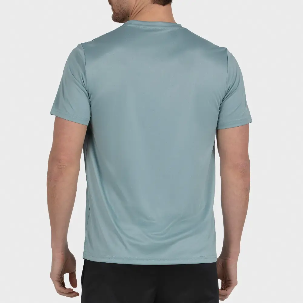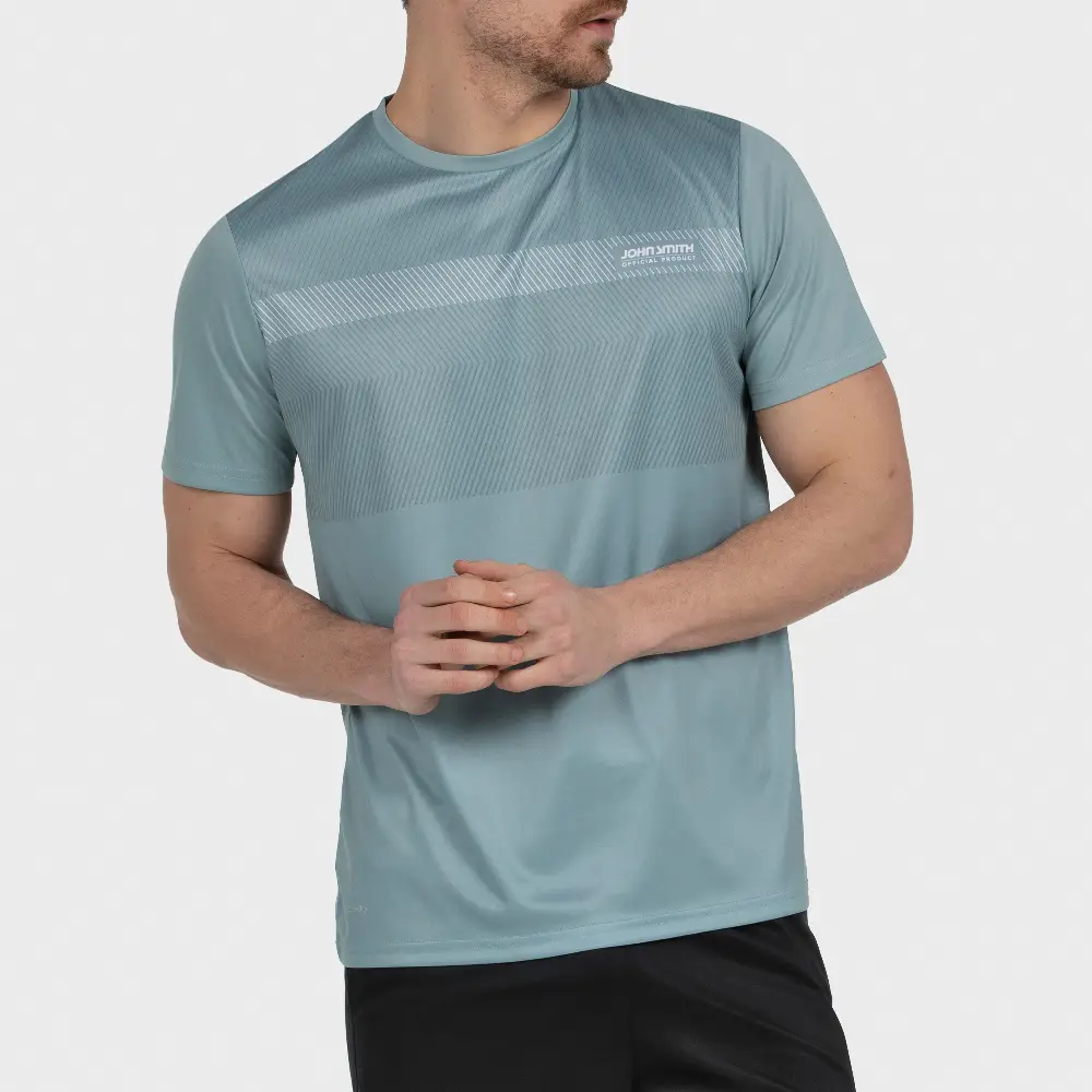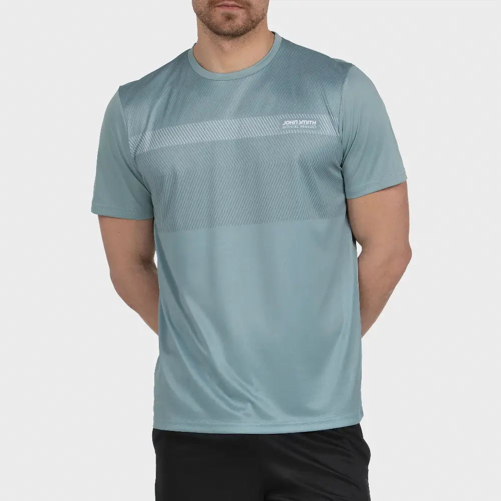 Camiseta JOHN SMITH BROVE Mentol para hombre, confeccionada en poliéster técnico. Ideal para entrenamientos, running y uso diario. Diseño deportivo con patrón diagonal, corte cómodo y logo en el pecho. Ligera, transpirable y perfecta para equipaciones deportivas o moda urbana.