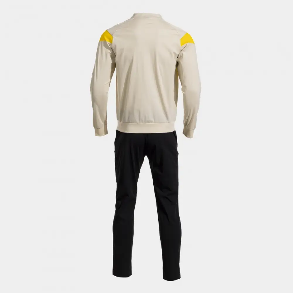 Chándal JOMA Montreal 104203.002 en combinación beige y negro, ideal para entrenamientos, calentamientos y uso deportivo diario. Fabricado en poliéster técnico resistente, ofrece comodidad, libertad de movimiento y un ajuste regular muy versátil. Incluye chaqueta con cremallera completa y pantalón largo a juego. Un conjunto moderno, funcional y perfecto para deportistas y clubes que buscan estilo y rendimiento
